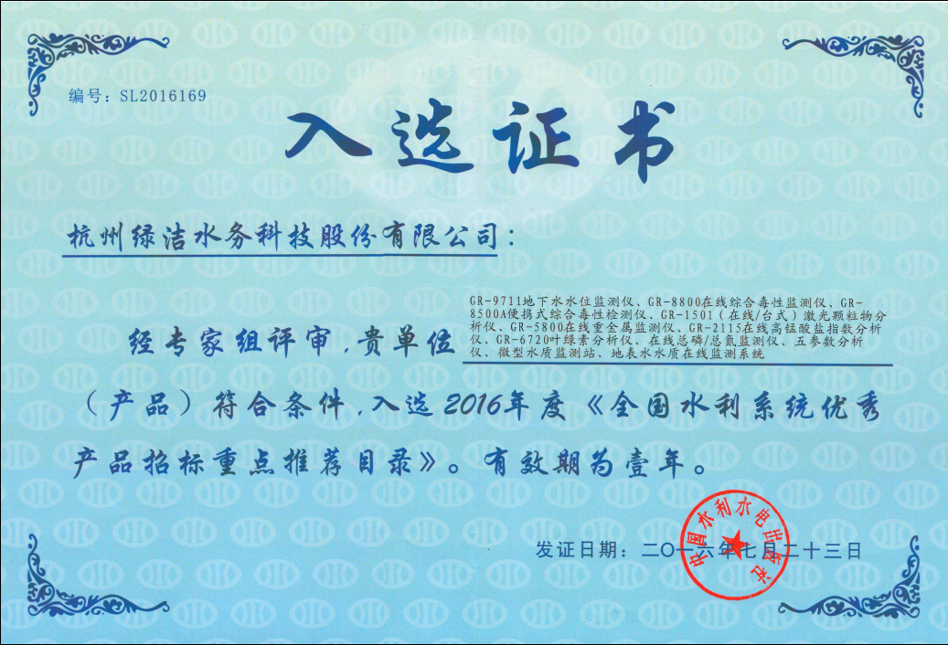7月,綠潔科技產品再度成功入選《全國水利系統優秀產品招標重點推薦目錄》?!度珖到y優秀產品招標重點推薦目錄》每年組織一次優秀產品的征集和評選,為各級水利管理機構提供選購真實、可靠的水利產品。