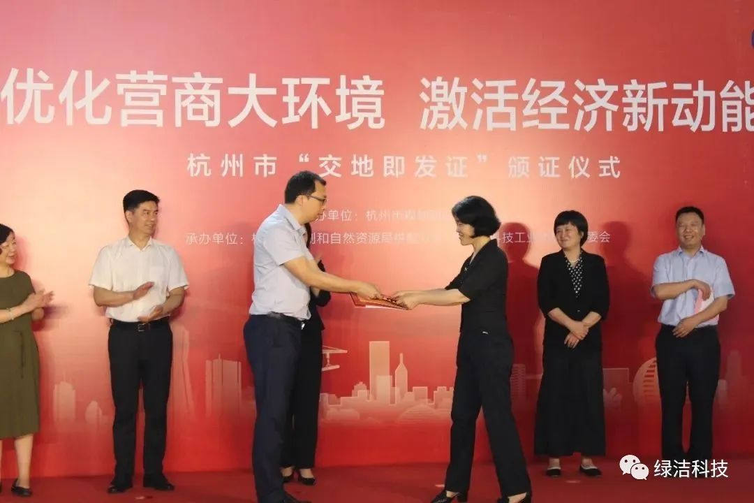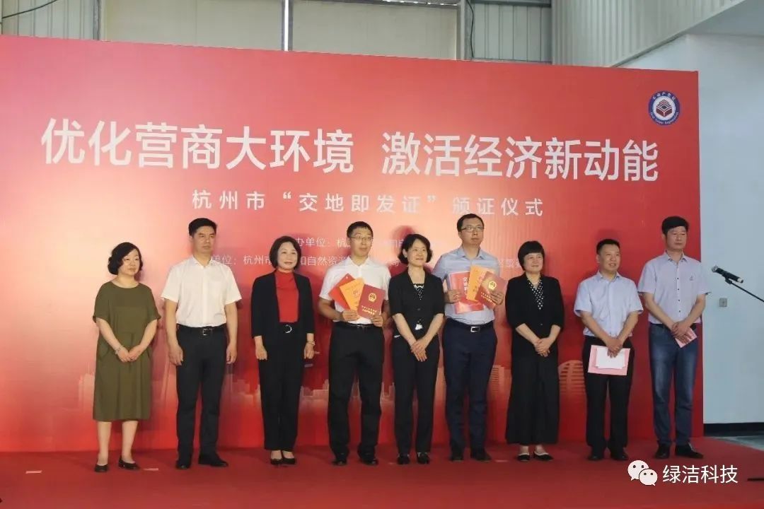 2020年6月5日,綠潔科技子公司杭開環境的分支機構杭州杭開綠興環境有限公司一次性拿到了交地確認書、建設用地規劃許可證、不動產權證“一書兩證”,是我省率先做到“交地即領證、領證零時差”的首例,而此次杭開兩地塊的發證是杭州市的首頒!